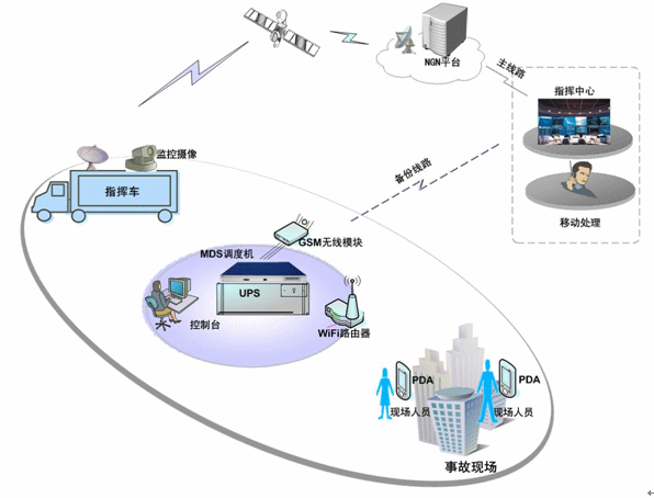 MDS調度機通過衛(wèi)星道與政府的NGN平臺對接,實現(xiàn)與整個城市的通信系統(tǒng)對接;并通過GSM、CDMA備份線路,實現(xiàn)多通信通道的實時切換,選擇最好的路由進行通信。MDS調度機負責語音通訊、調度作業(yè)和指令消息轉發(fā);應急指揮車配備調度機、調度臺、移動調度終端、衛(wèi)星接收設備、監(jiān)控視頻設備及其他設備。所有的調度語音終端都可與MDS調度系統(tǒng)對接,實現(xiàn)調度功能及與其他的通信終端進行通信。