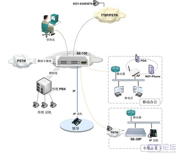 在企業(yè)總部可以部署一臺IP-PBX(如SE150)作為核心設(shè)備,通過模擬中繼接口連接PSTN電話網(wǎng),通過模擬分機接口連接企業(yè)原有的PBX交換機,再通過IP話機或網(wǎng)關(guān)來擴展新增用戶。IP-PBX下的分機用戶可以通過模擬中繼連接外線電話,也可以通過IP中繼連接到ITSP的NGN平臺實現(xiàn)外線呼叫,系統(tǒng)通過路由設(shè)定來自動判斷分機的對外呼叫應(yīng)該由哪條中繼處理,實現(xiàn)最優(yōu)路由和話費的最大節(jié)省。