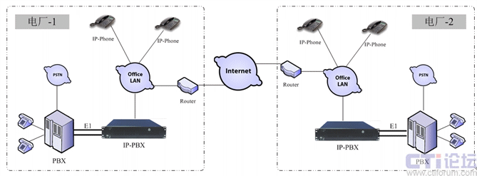 對(duì)于傳統(tǒng)的PBX改造,可以通過(guò)IP PBX的E1端口進(jìn)行連接,通過(guò)PRI或R2信令進(jìn)行通信,這樣傳統(tǒng)PBX下的分機(jī)就可以通過(guò)撥打連接IP PBX的中繼出局號(hào)來(lái)?yè)苋隫OIP系統(tǒng),例如撥“0”到PSTN,撥“9”到IP PBX。兩個(gè)電廠的傳統(tǒng)分機(jī),可以撥“9”后直接撥打?qū)Ψ椒謾C(jī),而IP話機(jī)都可以通過(guò)直撥的方式互通。