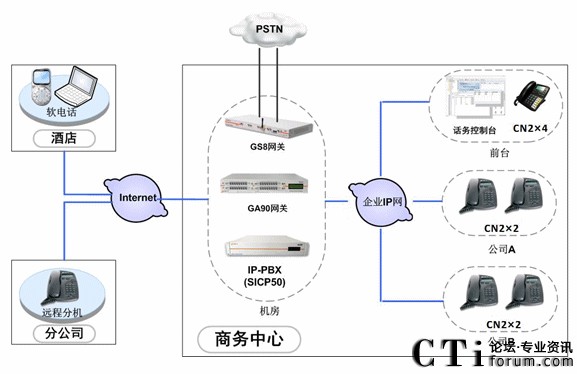 中天凱旋利用企業(yè)內(nèi)部完善的IP通信網(wǎng)絡(luò),在機(jī)房部署SICP系統(tǒng),負(fù)責(zé)整個(gè)語音通信系統(tǒng)的服務(wù)管理、用戶管理。部署GA90網(wǎng)關(guān)和GS8網(wǎng)關(guān),分別使用E1中繼線路和普通模擬線路接入PSTN網(wǎng)絡(luò),保證系統(tǒng)的通信。
