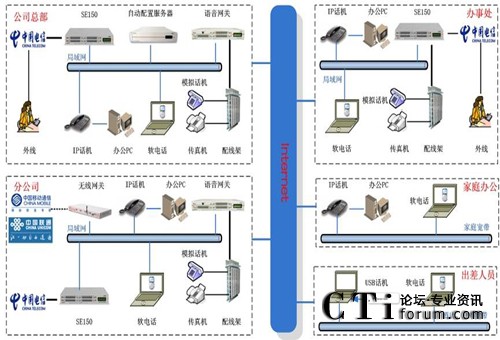 - 分布式部署:總部和各分支機(jī)構(gòu)的分機(jī),是通過(guò)IP網(wǎng)絡(luò)融合在一個(gè)語(yǔ)音平臺(tái)上來(lái)實(shí)現(xiàn)內(nèi)部通信?偛亢娃k事處分機(jī)、家庭辦公分機(jī)、出差人員的軟電話(huà)均注冊(cè)在總部的SE150上,各分公司的分機(jī)注冊(cè)在本地的SE150上,由本地的SE150管理。