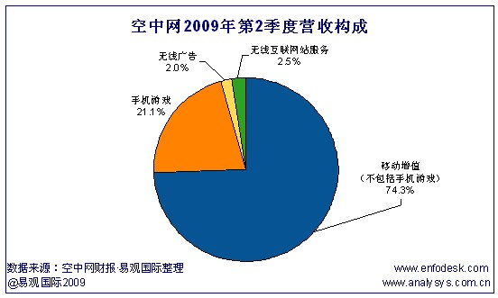 空中網(wǎng)2009年第2季度總營收為3230萬美元,其中總無線增值服務(wù)(不包括手機游戲)營收為2393萬美元,同比增長10%,比上一季度增長1%,占總營收的74.09%;手機游戲占總營收的21.05%,比上一季度增長38%;這一季度,空中網(wǎng)將無線廣告和無線互聯(lián)網(wǎng)站服務(wù)的收入共同歸為無線互聯(lián)網(wǎng)服務(wù)營收,總值為156萬美元,其中41%來自于無線廣告,59%來自于空中網(wǎng)無線互聯(lián)網(wǎng)站服務(wù)(包括虛擬物品銷售以及手機游戲和無線增值服務(wù)的交叉銷售)。易觀國際(Analysys
