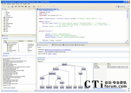 語法是語音應(yīng)用開發(fā)的一個重要方面。呼叫者可能會說的,諸如“我的帳單有問題”或“轉(zhuǎn)帳五百美元”之類的,必須建模以便語音識別引擎可以成功地理解它們。Nu Echo的NuGram IDE提供了一個工具套件有效地管理這些語法。自動完成和動態(tài)確認(rèn)這樣的生產(chǎn)率特性幫助創(chuàng)建語法規(guī)則。為了測試和調(diào)整,可以解析呼叫者語音樣本以便分析語法范圍和確保正確的語義翻譯。