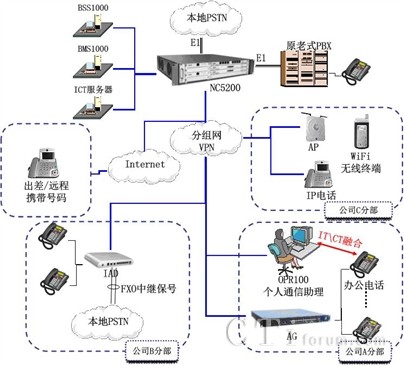 整個系統(tǒng)內(nèi)部通過主流標準協(xié)議聯(lián)結(jié),支持與運營商IMS網(wǎng)絡(luò)的無縫對接。新增分支機構(gòu)只需增加NC5200系列IP-PBX或者IAD即可融入公司整個通信系統(tǒng)。
