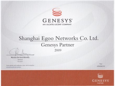 上海易谷與Genesys公司雙方在2009年達(dá)成大中華區(qū)長(zhǎng)期合作伙伴關(guān)系,開展廣泛、深入的合作。上海易谷將憑借其深厚的技術(shù)背景、優(yōu)質(zhì)的服務(wù)能力,積極推動(dòng)世界第一的CTI及SIP新一代呼叫中心基礎(chǔ)平臺(tái)。為配合產(chǎn)品多樣化、專業(yè)服務(wù)的發(fā)展戰(zhàn)略,與 Genesys公司達(dá)成合作意向。