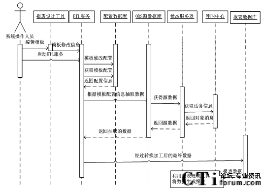 在ETL服務(wù)運行時,首先它會從配置數(shù)據(jù)庫中獲取模板的配置信息,并且根據(jù)其配置信息從ODS源數(shù)據(jù)庫中抽取數(shù)據(jù)。ODS源數(shù)據(jù)庫中的數(shù)據(jù)是狀態(tài)服務(wù)器從呼叫中心中獲得的。在ETL抽取數(shù)據(jù)后對其進(jìn)行轉(zhuǎn)換和加工,將其加載到報表數(shù)據(jù)庫中。并利用報表展現(xiàn)工具將報表數(shù)據(jù)展現(xiàn)出來。其最終設(shè)計的系統(tǒng)各部件交互時序圖如圖3.5所示。