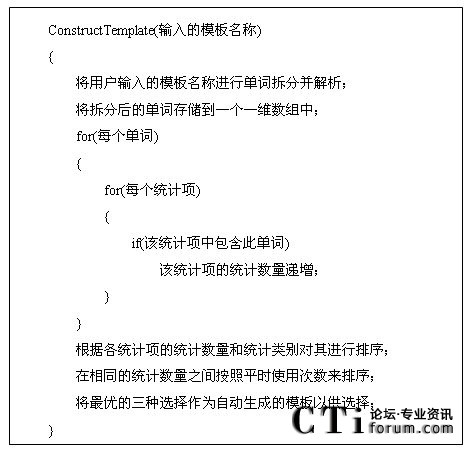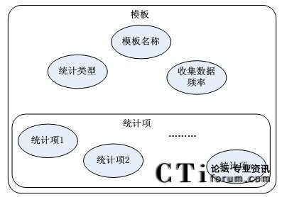 由模板結(jié)構(gòu)框架圖得知,模板包括模板名稱,數(shù)據(jù)統(tǒng)計(jì)對象,收集數(shù)據(jù)的頻率和多個(gè)基本統(tǒng)計(jì)項(xiàng)。其中,每個(gè)統(tǒng)計(jì)項(xiàng)對應(yīng)著統(tǒng)計(jì)對象(如:坐席,路由點(diǎn)等)的一條統(tǒng)計(jì)內(nèi)容信息(如:1小時(shí)內(nèi)的呼叫總量等)。然后由這些統(tǒng)計(jì)項(xiàng)和統(tǒng)計(jì)參數(shù)組合成模板,從而構(gòu)成對呼叫中心對象的統(tǒng)計(jì)信息。