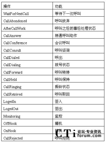 在呼叫中心服務(wù)器發(fā)送事件時(shí),它都會(huì)對事件的對象指定的一個(gè)狀態(tài)。在任何時(shí)間,ODS源數(shù)據(jù)庫中,每個(gè)對象都被指定成一個(gè)唯一的狀態(tài)。這些狀態(tài)都來自話務(wù)對象的操作。