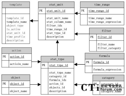 在模板配置存儲(chǔ)模型圖中,分別建立了單獨(dú)的表對模板劃分的每一個(gè)基本對象進(jìn)行儲(chǔ)存。表template存儲(chǔ)模板的配置信息,stat_unit表存儲(chǔ)了統(tǒng)計(jì)項(xiàng)的基本信息,stat_type表是一些有關(guān)模板具體內(nèi)容的配置。各表之間通過各自的ID標(biāo)識(shí)號來進(jìn)行關(guān)聯(lián)。不過一個(gè)模板可以包括多個(gè)統(tǒng)計(jì)單元,一個(gè)統(tǒng)計(jì)項(xiàng)可以包含多個(gè)過濾項(xiàng),一個(gè)統(tǒng)計(jì)內(nèi)容可以包含多個(gè)公式,這樣他們之間的ID關(guān)聯(lián)就成為1對多的關(guān)系。在這種情況下,父項(xiàng)中的ID關(guān)聯(lián)多個(gè)子項(xiàng)ID,其間是用逗號分隔。