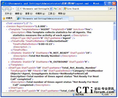 在模板導(dǎo)出的XML儲(chǔ)存圖中,ReportVersion屬性為報(bào)表系統(tǒng)的版本號。Template信息用來指定一個(gè)模板名字,給模板一個(gè)唯一的模板ID,再指定該模板是否激活,另外也為該模板添加了注釋。該例中是對所有坐席活動(dòng)的數(shù)據(jù)進(jìn)行統(tǒng)計(jì)。ObjectType為模板的統(tǒng)計(jì)類型,該模板中統(tǒng)計(jì)類型為坐席(Agent)。TimeProfile為設(shè)定收集的時(shí)間間隔,本例中為從每天的0點(diǎn)0分開始,每隔15分鐘收集一次。Statistic對應(yīng)了一個(gè)統(tǒng)計(jì)內(nèi)容配置,根據(jù)StatTypeID在下面將列出詳細(xì)內(nèi)容。本例中StatTypeID為19,下面的StatType中將會(huì)根據(jù)StatTypeID與之相對應(yīng),其中配置了Category,