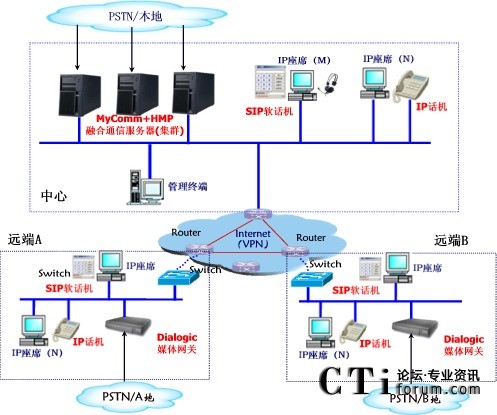 在一臺PC服務(wù)器或工業(yè)用控制計(jì)算機(jī)上,通過安裝MyCommIPS和Dialogic HMP軟件統(tǒng)一支持語音、傳真、會議、錄音和呼叫的IP媒體處理。