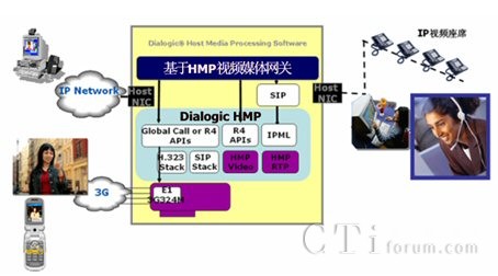 基于Dialogic HMP(Host Media processing)主機媒體處理技術(shù)的視頻呼叫中心主要通過網(wǎng)絡接口卡(“瘦卡”,Digital Network Interface卡)與PSTN(3G)相連。這里的PSTN包括電信、聯(lián)通和移動等電信運營商。也可以通過H.323、SIP協(xié)議棧直接接受來自數(shù)據(jù)網(wǎng)絡的多媒體呼叫。