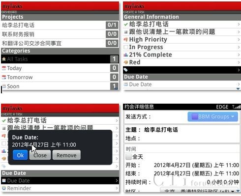 CTI論壇(ctiforum)4月26日消息(記者 歐陽): 再過幾天就是五一勞動節(jié)小長假啦!節(jié)前的最后幾天相信大家都在快馬加鞭想把手頭上的工作盡快處理完畢,好能過個安心的節(jié)日假期。我們也特別為大家搜集了黑莓智能手機(jī)上能夠在效率方面助大家一臂之力的幾款應(yīng)用,希望它們可以在工作生活中為諸位帶來切實有效的幫助!