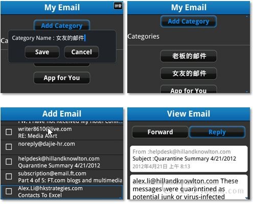 及時、安全的郵件收發(fā)是黑莓手機(jī)用戶鐘愛黑莓的重要原因之一。然而,當(dāng)成千上百封郵件堆積在郵件系統(tǒng)內(nèi),疏于整理和歸類,以至于你無法找到或者挑選你想要的那封郵件中的信息時,你可能就沒那么Happy了吧?My Email應(yīng)用,可以稱之為你郵件系統(tǒng)的“管家婆”,安裝了它之后,你可以將所有郵件有條理的進(jìn)行分類管理:公私分明、客戶分明、項目分明、老板同事分明,想瀏覽哪類郵件一目了然。此外,對于那些及其重要的郵件,“管家婆”還可以幫你儲存在SD卡上,即使原郵件已經(jīng)被刪除,儲存的郵件也可以被找回,如此一來,有限的手機(jī)存儲空間中就不必再存儲大量無關(guān)緊要的各種郵件,騰點空間給你心水的各種音樂圖片和視頻吧。