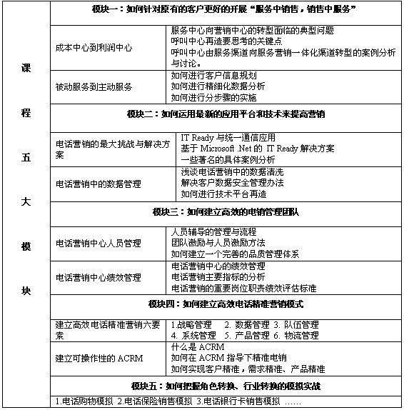 本課程以系統(tǒng)化的眼光,結(jié)合多個國際國內(nèi)領(lǐng)先企業(yè)的營銷與管理實(shí)踐案例,與您分享國內(nèi)領(lǐng)先的呼叫中心和電話營銷中心的戰(zhàn)略與運(yùn)營經(jīng)驗(yàn),對現(xiàn)有資源進(jìn)行合理評估,解決實(shí)際問題與困惑,突破面臨的瓶頸,整個課程具有高度的實(shí)戰(zhàn)性與可操作性。