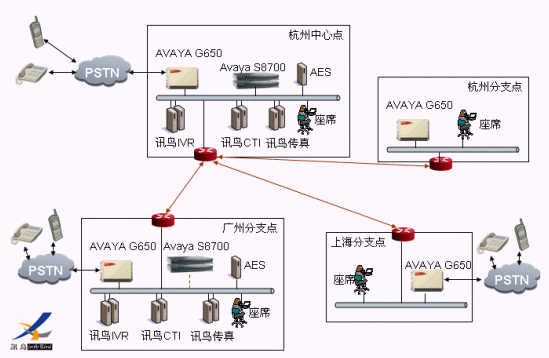 S8710、一套訊鳥CTI/IVR/傳真集中控制,其他各點(diǎn)通過G650接入。其中廣州分支點(diǎn)由于座席數(shù)較多,單獨(dú)部署一臺(tái)AES服務(wù)器、一套訊鳥CTI/IVR/傳真服務(wù)器。廣州點(diǎn)的一套AVAYA