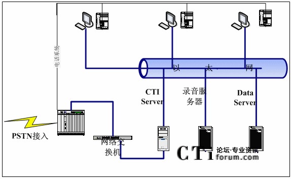 消費(fèi)者撥打訂購(gòu)電話,經(jīng)PSTN接入到呼叫中心交換機(jī),由CTI服務(wù)器(CTI Server)通過(guò)交換機(jī)將話務(wù)分配到相應(yīng)空閑坐席。坐席端記錄訂購(gòu)信息及消費(fèi)者信息,并將信息存入數(shù)據(jù)服務(wù)器(DataServer)。交換機(jī)對(duì)通話進(jìn)行全程錄音,并存入錄音服務(wù)器。同時(shí)可把進(jìn)入系統(tǒng),但未排隊(duì)到坐席的話務(wù)數(shù)據(jù)記錄存入數(shù)據(jù)庫(kù)服務(wù)器,以便回訪。