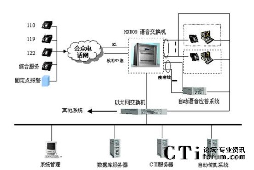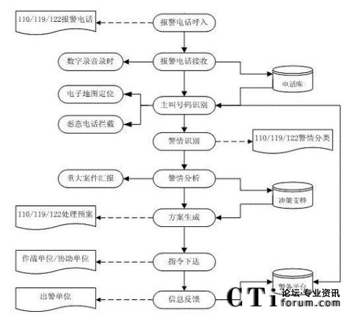 該系統(tǒng)主要分為電信子系統(tǒng)(完成聯(lián)動中心與各電信公司之間話音的傳輸、交換和分配,以及主叫號碼和主叫地址的自動查詢和傳輸?shù)龋、接警中心子系統(tǒng)(統(tǒng)一接聽和處理市民的報警、求助電話)、指揮調度子系統(tǒng)(或稱為處警中心,通過直觀的地理信息系統(tǒng)和數(shù)據(jù)庫,可以對所有的資源和警力分布了如指掌。通過一體化的無線數(shù)據(jù)傳輸和無線調度臺進行方便的統(tǒng)一管理,指揮和調度)、信息網(wǎng)絡子系統(tǒng)(聯(lián)動中心的骨干網(wǎng)絡,把各種數(shù)據(jù)數(shù)庫、接處警席位、移動的警用車載計算機等互聯(lián)在一起,形成一個強大的信息網(wǎng)絡)、無線指揮調度通信子系統(tǒng)、大屏幕顯示子系統(tǒng)、地理信息子系統(tǒng)、GPS/GIS子系統(tǒng)。