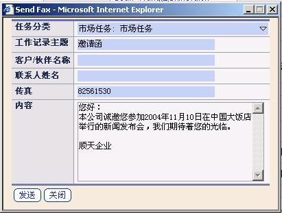 在與客戶進行接觸的時候,為了提高信息傳遞的及時性,傳真也是一個不錯的選擇。TurboCRM系統(tǒng)可以幫助企業(yè)通過發(fā)送傳真的形式與自己的客戶進行接觸,比如:企業(yè)需要在短時間內(nèi)發(fā)送一批活動邀請函和申請表,就可以利用這種發(fā)送批量傳真的形式,比之信件的傳遞方式不僅節(jié)省成本,而且為企業(yè)節(jié)省了寶貴的時間。