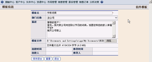 電子郵件接觸方式可以方便企業(yè)在極短的時間內(nèi)為大量的客戶發(fā)布各種信息,比如:企業(yè)需要為客戶提供的促銷信息、服務(wù)通告,或者節(jié)日問候等。TurboCRM系統(tǒng)可以將郵件模板與選取的客戶資料進行自動匹配,瞬間即可將信息發(fā)送給大量客戶。