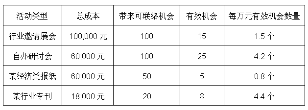 從前面的分析中,我們?cè)?jīng)談到過:市場(chǎng)的核心是用最低的成本,幫助企業(yè)把目標(biāo)客戶推動(dòng)成為機(jī)會(huì)客戶。那么,同樣成本推動(dòng)為有效機(jī)會(huì)客戶數(shù)量的多少,則是評(píng)價(jià)市場(chǎng)方案的有效模型。當(dāng)然,針對(duì)個(gè)人消費(fèi)市場(chǎng),似乎可以用更加簡(jiǎn)單的投入產(chǎn)出比進(jìn)行分析,一種類型的市場(chǎng)投放運(yùn)作,在一定時(shí)間內(nèi)帶來的業(yè)績(jī)收益與成本的比較,可以方便地了解到不同類型市場(chǎng)投放的效益對(duì)比;而對(duì)于大部分需要有銷售過程的機(jī)構(gòu)消費(fèi)客戶,我們可以參考以下我們對(duì)劉總公司拿出的模型示例: