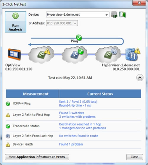 OptiView XG v8 具備兩種新的故障排除功能:一鍵 NetTest 和自動(dòng)多段分析,能夠迅速確定數(shù)據(jù)路徑以及隔離出物理和虛擬網(wǎng)絡(luò)中的問題。只需按一下按鍵,一鍵 NetTest 就能找出單個(gè)屏幕視圖里的連接路徑。