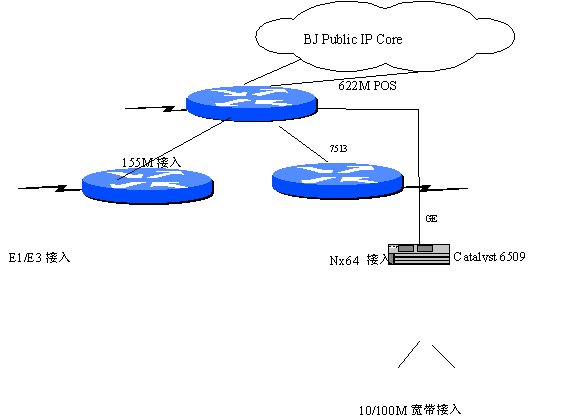 北京電信公眾IP網(wǎng)中,骨干網(wǎng)核心節(jié)點(diǎn)路由器為業(yè)界最 先進(jìn)的新一代電信級高性能的路由交換機(jī) Cisco GSR 12016太比特系統(tǒng); 邊緣節(jié)點(diǎn)路由器為GSR 12008,Cisco 7513;10/100M局域網(wǎng)接入設(shè)備為Catalyst 6509交換機(jī)。