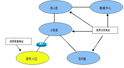 考慮IP地址資源有限,因此,居民小區(qū)接入用戶量大,地址使用效率低,因此在居民小區(qū)部分采用RFC 1519規(guī)定的保留地址,建議采用10.0.0.0。在每個小區(qū)的出口處配備地址轉(zhuǎn)換設(shè)備,實現(xiàn)保留地址和合法地址之間的轉(zhuǎn)換。