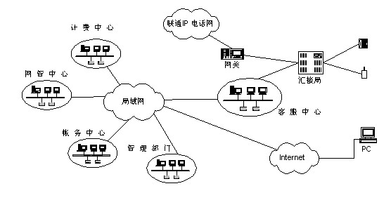 聯(lián)通北京分公司將客戶服務(wù)系統(tǒng)與現(xiàn)有計(jì)費(fèi)、營業(yè)、帳務(wù)系統(tǒng)進(jìn)行組織,形成了一個有機(jī)的結(jié)合體,能夠充分發(fā)揮出現(xiàn)有系統(tǒng)的優(yōu)勢?蛻舴⻊(wù)系統(tǒng)從營業(yè)帳務(wù)系統(tǒng)提取相關(guān)用戶資料,建立客戶服務(wù)的系統(tǒng)資料庫,從計(jì)費(fèi)系統(tǒng)提取相關(guān)用戶話費(fèi)資料等供查詢使用。同時(shí)客服系統(tǒng)還將與北京聯(lián)通現(xiàn)有的計(jì)費(fèi)、營業(yè)、帳務(wù)、網(wǎng)管等相關(guān)系統(tǒng)以及Internet相連,提供業(yè)務(wù)處理和用戶自助服務(wù)等業(yè)務(wù)。本客服中心通過2對路由器和DDN專線與聯(lián)通北京分公司現(xiàn)有的局域網(wǎng)(包括管理部門、網(wǎng)管中心、計(jì)費(fèi)中心、帳務(wù)中心等相關(guān)系統(tǒng))連接,并通過該局域網(wǎng)訪問Internet。