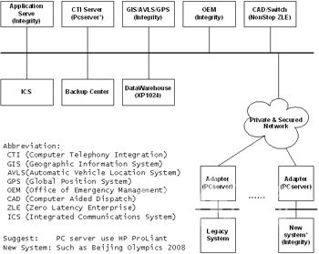 結(jié)合HP公司在全球范圍內(nèi)911應(yīng)急系統(tǒng)和安全領(lǐng)域的建設(shè)經(jīng)驗和案例,HP公司針對國內(nèi)對公共安全建設(shè)的需求,提供了公共安全系統(tǒng)的建設(shè)架構(gòu)和解決方案 --- HP公共安全ODS+EAI核心解決方案。如下圖示