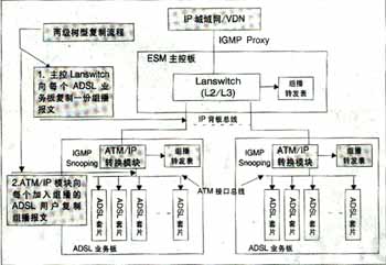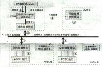 可實現(xiàn)高效的兩級組播;诳臻g總線上的組播信元技術實現(xiàn),與組播用戶數無關,同一節(jié)目即使所有用戶加入該頻道,僅需復制一份,不用逐個用戶復制到每個用戶端口,極大節(jié)省了背板帶寬,減輕IP上行負擔?蓪崿F(xiàn)高性能硬件組播轉發(fā)。IP上行板采用超大規(guī)模FPGA硬件邏輯處理組播報文,ADSL板采用空間組播處理硬件芯片自動完成向每個ADSL端口(用戶)的組播復制,每ADSL端口組播帶寬6M。