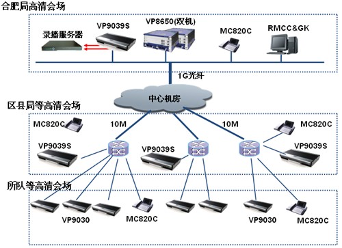 為滿足安徽省煙草合肥市公司日常工作會議、集中培訓(xùn)、遠(yuǎn)程匯報(bào)等工作業(yè)務(wù)需求,同時(shí)為應(yīng)對突發(fā)事件提供可靠可行的交互平臺,實(shí)現(xiàn)多地點(diǎn)、遠(yuǎn)距離的視頻、音頻和數(shù)據(jù)的互通交流。深圳市金華威數(shù)碼科技有限公司工程師建議新建的視訊系統(tǒng)采用高清的視頻會議組網(wǎng)模式,其中市局、三縣與區(qū)局、所隊(duì)及營銷部所有會場節(jié)點(diǎn)建設(shè)高清視頻會議系統(tǒng)。