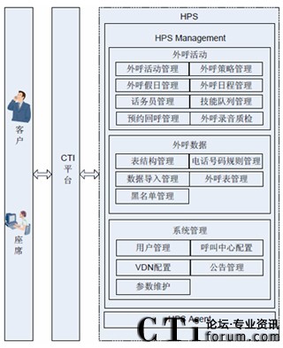 HPS 提供外呼活動(dòng)、外呼數(shù)據(jù)的管理、系統(tǒng)管理以及座席業(yè)務(wù)管理的功能。功能結(jié)構(gòu)圖如下: