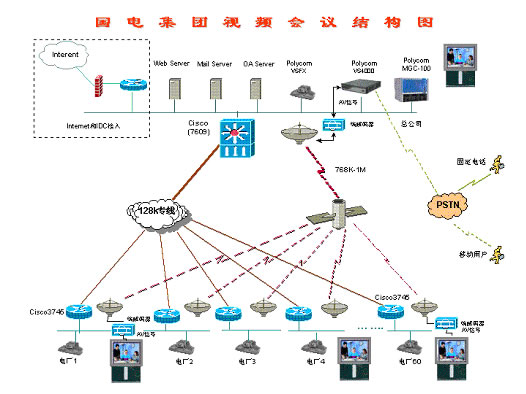 128,集團下屬60個電廠均采用視頻終端ViewStation 128。整個網(wǎng)絡(luò)采用Polycom MCU的混速功能,在本部中心采用768Kbps進(jìn)行視頻傳輸,和下屬60個電廠及分公司采用128Kbps進(jìn)行傳輸。由于網(wǎng)絡(luò)傳輸線路分為衛(wèi)星線路和地面有線網(wǎng)絡(luò),衛(wèi)星線路帶寬為768Kbps-1Mbps,用于業(yè)務(wù)下行線路,地面有線網(wǎng)絡(luò)128Kbps用于視頻回傳。根據(jù)網(wǎng)絡(luò)傳輸線路的實際情況,在本部中心利用1臺視頻終端將其模擬信號(AV信號)送到衛(wèi)星端接設(shè)備(包含MODEM,編解碼器等),將模擬信號轉(zhuǎn)換成數(shù)字信號(MPEG4),利用768K-1Mbps衛(wèi)星線路廣播到每個接收點,通過每個接收點的編解碼器將數(shù)字信號轉(zhuǎn)換成模擬信號連接到顯示終端(如TV、顯示器)上進(jìn)行收看,通過這種方式可以實現(xiàn)利用衛(wèi)星線路的高帶寬,并利用其廣播特性,節(jié)省投資。