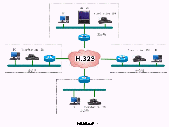 結合遼寧省消防網絡,本方案設計的視頻會議系統(tǒng)承載在遼寧省消防局的IP網絡平臺上,采用國際流行的ITU H.323通信標準。系統(tǒng)采用以MCU為中心輻射各個會場電視會議終端的星型網絡結構。整套系統(tǒng)由16個會場組成,采用美國Polycom公司的ViewStation 128會議室型終端設備。網管中心安放一臺Polycom 公司的MGC-50(多點會議控制單元),用于對全網終端的控制,實現(xiàn)多點、點對點的會議。