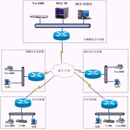 中心MCU采用美國POLYCOM公司 MGC-50多點控制單元,安裝在中儲糧北京總公司的中心機房。北京總公司主會場安放POLYCOM VSX