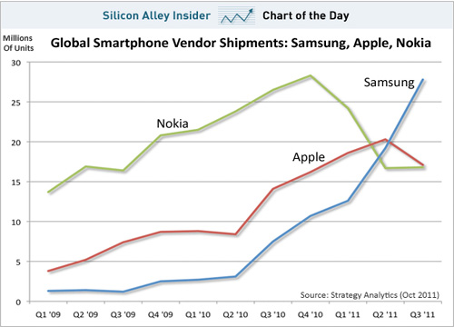 圖:全球智能手機出貨量:諾基亞、三星和蘋果