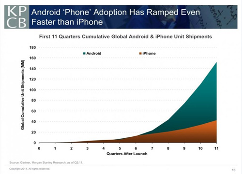 圖:Android和iPhone前11季度累計出貨量對比