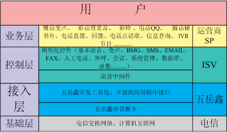 依靠五岳鑫公司強(qiáng)大的技術(shù)優(yōu)勢(shì)和對(duì)增值業(yè)務(wù)的深刻理解,以我公司自主研發(fā)的具有國(guó)際先進(jìn)水平的語(yǔ)音板卡為基礎(chǔ),為廣大增值業(yè)務(wù)服務(wù)商提供的語(yǔ)音增值業(yè)務(wù)綜合平臺(tái),將種類繁多的語(yǔ)音增值業(yè)務(wù)融合在一個(gè)系統(tǒng)平臺(tái)中。不僅支持行業(yè)內(nèi)大多數(shù)的語(yǔ)音增值業(yè)務(wù),還能方便、快速地面向市場(chǎng)提供各種的語(yǔ)音增值業(yè)務(wù)。