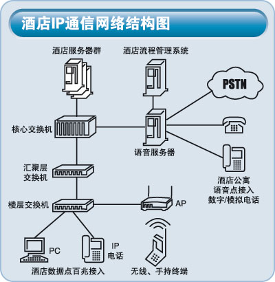 由于IP通信對帶寬和系統(tǒng)性能的要求并不高,因此可以充分利用酒店原有網(wǎng)絡(luò)架構(gòu),重新劃分VLAN和無線局域網(wǎng)資源分配,同時滿足IP電話的通話需求、客房寬帶網(wǎng)絡(luò)的使用,以及無線接入、移動辦公等需求。即獲得優(yōu)化的應(yīng)用又保護(hù)了用戶的投資。