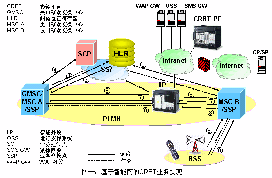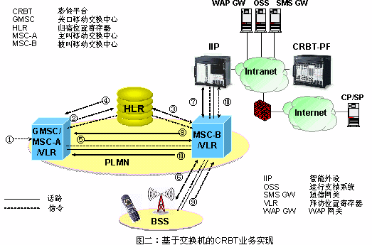 智能網(wǎng)方案對(duì)現(xiàn)有的網(wǎng)絡(luò)改動(dòng)較小,可以快速開(kāi)展彩鈴業(yè)務(wù)。但是,在現(xiàn)有的智能網(wǎng)網(wǎng)絡(luò)條件下,該方案會(huì)造成話路迂回,占用過(guò)多的中繼資源;而且整個(gè)呼叫過(guò)程中都要占用CRBT-IP,容易造成話務(wù)負(fù)載過(guò)大,限制了CRBT業(yè)務(wù)的用戶數(shù)量。
