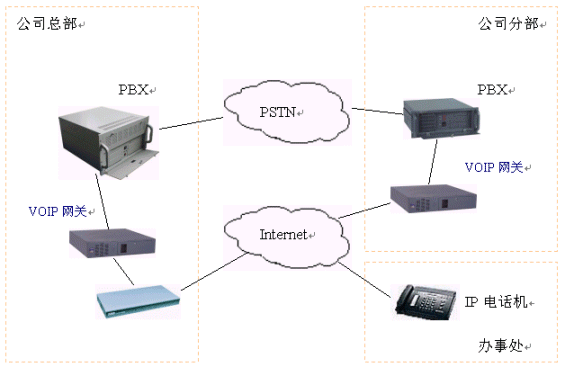用VOIP網(wǎng)關(guān)構(gòu)建整個(gè)IP電話系統(tǒng)可以采取以下方式(拓?fù)鋱D見(jiàn)下圖):