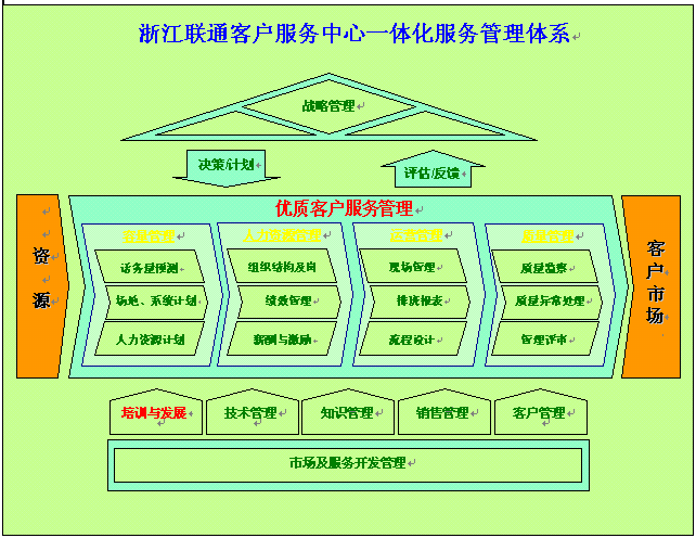 在新的客服管理體系下,浙江聯(lián)通客戶服務中心將在總公司的客服戰(zhàn)略發(fā)展指引下,以目標客戶市場為對象,以浙江聯(lián)通企業(yè)現(xiàn)有的品牌、網(wǎng)絡、產(chǎn)品、和客戶資源為基礎,從容量管理、人力資源管理、運營管理、質量管理和培訓發(fā)展五個核心管理層面入手,結合技術管理、知識管理、銷售管理、客戶管理和市場及服務開發(fā)管理,以PDCA循環(huán)為管理手段,整體提高客戶服務管理水平,達成'客戶滿意'的最終服務目標。