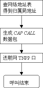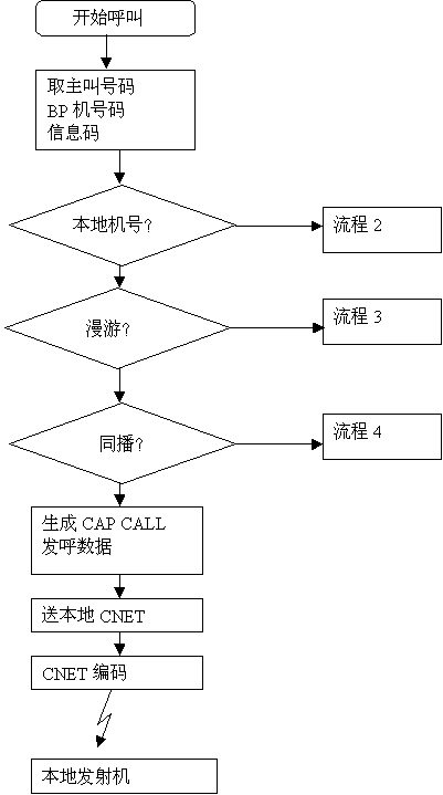 異地呼叫漫游到本地的異地機(jī)時(shí),異地發(fā)出的CAP CALL會(huì)送入本地發(fā)呼工作站,發(fā)呼工作站僅修改其目的地址,把它轉(zhuǎn)發(fā)給本地CNETCNET送到編碼器編碼后送到發(fā)射機(jī)發(fā)射,完成呼叫過程。詳見流程5