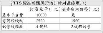 jTTS標(biāo)準(zhǔn)版在聲音質(zhì)量、聲音平滑度、自然度等方面已具有比較高的實(shí)用化水平。為了真正啟動(dòng)語音技術(shù)的應(yīng)用市場,捷通華聲啟動(dòng)“颶風(fēng)行動(dòng)”,在活動(dòng)期間為最終客戶、系統(tǒng)集成商制定了一個(gè)極具競爭力的價(jià)格,并且無平臺(tái)費(fèi)。這次活動(dòng)主要針對CTI領(lǐng)域中大量中小型系統(tǒng)的應(yīng)用開展此次活動(dòng),目的是讓先進(jìn)的技術(shù)能夠被更多的用戶采用,為系統(tǒng)集成商應(yīng)用TTS技術(shù)提供了很高的利潤空間。