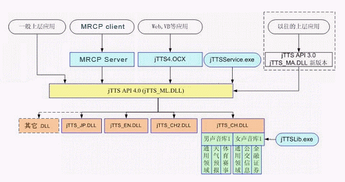 Programming Interface),即jTTS API 4.0,以及統(tǒng)一的多語種引擎管理模塊,即jTTS_ML.DLL。多語種的引擎(例如中文引擎jTTS_CH.DLL,英文引擎jTTS_EN.DLL等)在多語種引擎管理模塊的調(diào)度下進(jìn)行實(shí)際的合成工作,而目前尚未提供的其他語種的引擎也可以方便地加入到這個(gè)體系結(jié)構(gòu)中來。