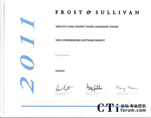 CTI論壇(ctiforum)1月12日消息(記者 浩宇):全球領(lǐng)先的Web會(huì)議解決方案供應(yīng)商V2威速宣布,榮獲全球領(lǐng)先咨詢(xún)公司Frost&Sullivan頒發(fā)的“大中華區(qū)Web軟件會(huì)議市場(chǎng)份額領(lǐng)導(dǎo)者”殊榮。Frost & Sullivan設(shè)立該獎(jiǎng)項(xiàng)旨在表彰各個(gè)行業(yè)領(lǐng)域在過(guò)去一年業(yè)績(jī)表現(xiàn)最佳并占有最高市場(chǎng)份額的企業(yè)。