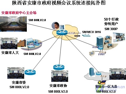 讓安康市政府尤為滿意的是,瑞福特的專業(yè)服務(wù)團(tuán)隊(duì),為其量身定制了最適合的解決方案:1臺(tái)MCU 3016視頻會(huì)議服務(wù)器放在機(jī)房;15臺(tái)視頻會(huì)議硬件終端SM880L部署在市中心會(huì)場(chǎng)以及各縣級(jí)政府會(huì)議室;50套軟件終端SM300安裝在PC和筆記本電腦上,輕松實(shí)現(xiàn)了安康市政府各項(xiàng)視頻會(huì)議應(yīng)用以及緊急事件的應(yīng)急指揮和溝通。