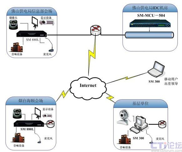 根據(jù)佛山供電局的需求特點(diǎn),網(wǎng)絡(luò)及工程建設(shè)現(xiàn)狀,瑞福特為其定制了一套解決方案。整個(gè)方案軟硬結(jié)合,完全基于現(xiàn)有網(wǎng)絡(luò)基礎(chǔ)上,通過接入設(shè)備實(shí)現(xiàn)音、視頻及數(shù)據(jù)的實(shí)時(shí)交互傳輸。所有的設(shè)備組成如下:一臺(tái)4用戶的視頻服務(wù)器SM MCU 504,主要放置于電力局總部,在4個(gè)會(huì)議配備硬件終端使用SM 880L,另外桌面軟件終端使用SM 300。
