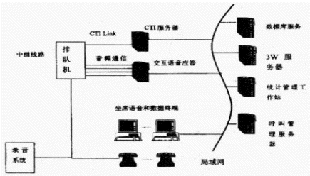 中型呼叫中心:人工座席在50~100之間的呼叫中心稱(chēng)為中型呼叫中心。中型呼叫中心PBX與CTI服務(wù)器、人工座席直接相連,人工座席又與應(yīng)用服務(wù)器相連,客戶資料存儲(chǔ)在應(yīng)用服務(wù)器中,應(yīng)用服務(wù)器實(shí)時(shí)地將打入電話的客戶的資料自動(dòng)地在計(jì)算機(jī)屏幕上彈出,使座席人員能及時(shí)獲得相應(yīng)信息。CTI服務(wù)器一般由CTI硬件開(kāi)發(fā)商的板卡和PC組成。